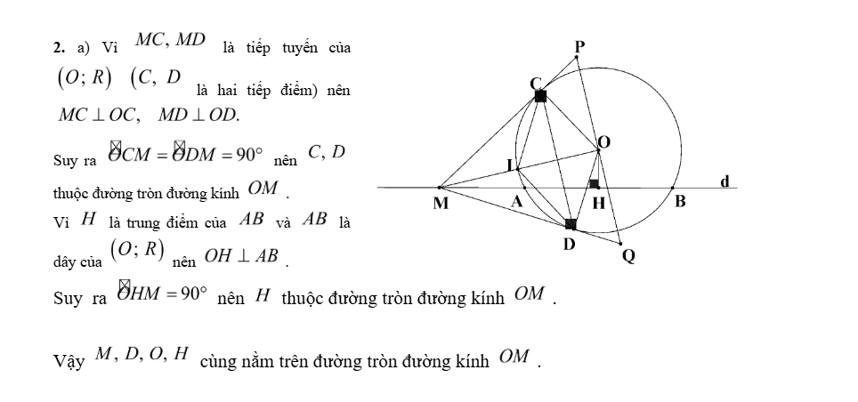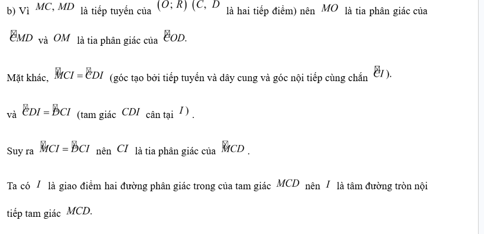 b) Đoạn OM cắt đường tròn tại I. Chứng minh rằng I là tâm đường tròn nội tiếp tam giác MCD