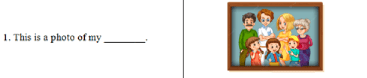 Hi. My name is Kate. There are three people in my family: my father, my mother and me. We are in the (1) _____________. My (2) ________ is drawing a picture. My mother is (3) __________ . I am (4) ____________ a kite. That is our (5) ____________. It is playing with its toy.