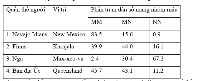 Nhóm máu MN ở người được xác định bởi hai allele đồng trội M và N. Khi nghiên cứu thành phần nhóm máu ở các quần thể người khác nhau, thu được kết quả sau: