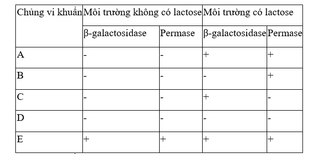 Ở vi khuẩn E.coli kiểu dại, sự biểu hiện của gene lac Z (mã hóa β-galactosidase), gene lac Y (mã hóa permase) thuộc operon Lac phụ thuộc vào sự có mặt của lactose trong môi trường nuôi cấy. Bằng kỹ thuật gây đột biến nhân tạo, người ta đã tạo ra được các chủng vi khuẩn khác nhau và được nuôi cấy trong hai môi trường: không có lactose và có lactose. Sự biểu hiện gene của các chủng vi khuẩn được thể hiện ở bảng sau:
