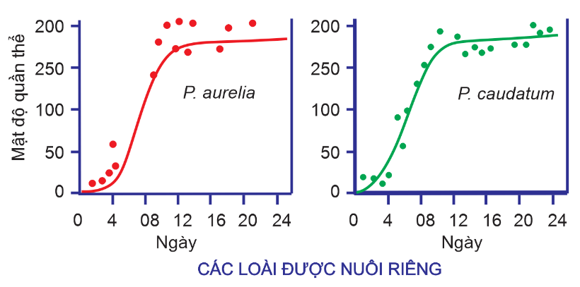 Khi nghiên cứu mối quan hệ sinh thái giữa các loài có quan hệ gần gũi, nhà khoa học Gause đã tiến hành nuôi 2 loài trùng cỏ: Paramecium aurelia, Paramecium caudatum trong 2 trường hợp với điều kiện dinh dưỡng và các nhân tố sinh thái cần thiết giống nhau. Kết quả thí nghiệm được thể hiện ở hình sau: