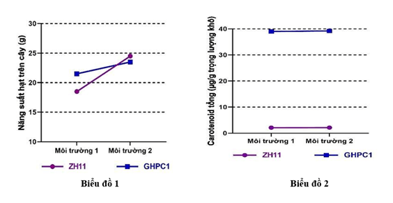 Để nghiên cứu sự biểu hiện tính trạng năng suất và hàm lượng carotenoid tổng số ở hai giống lúa (Oryza sativa L.) là ZH11 và GHPC1 trong các điều kiện gieo trồng khác nhau, nhà chọn giống tiến hành bố trí thực nghiệm và thu được các kết quả được trình bày theo hai đồ thị hình bên dưới. Hãy phân tích dữ liệu từ hai biểu đồ trên và cho biết nhận định nào sau đây là đúng?