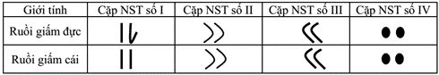 Hình 1 dưới đây mô tả hình thái các cặp nhiễm sắc thể trong bộ nhiễm sắc thể lưỡng bội (2n = 8) ở ruồi giấm bình thường. Hình 1 Cặp nhiễm sắc thể giới tính ở ruồi giấm theo mô tả của hình trên là