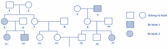Phả hệ sau đây mô tả sự di truyền của 2 bệnh. Biết rằng người số 6 không mang allele gây bệnh 1, người số 8 mang allele bệnh 2; gene gây bệnh 1, 2 phân li độc lập và không xảy ra đột biến. Có thể xác định tối đa kiểu gene của bao nhiêu người trong phả hệ trên?