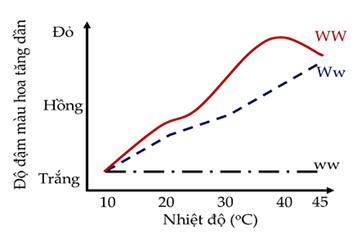 Ở một loài hoa mõm chó, khả năng chuyển tiền chất trắng sang sắc tố đỏ do một enzyme X tác động. Enzyme này được mã hóa bởi một locus gene gồm 2 allele là W và w. Mức độ biểu hiện màu sắc hoa của từng kiểu gene (WW, Ww, ww) liên quan đến lượng sắc tố tổng hợp thay đổi tùy thuộc vào nhiệt độ trong giới hạn sinh thái của loài (từ 10℃ – 45℃) được thể hiện trong biểu đồ 3. Phát biểu sau đây không đúng?