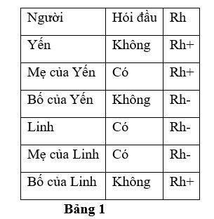 Ở người, gene quy định tính trạng hói đầu bị ảnh hưởng bởi giới tính. Phụ nữ có kiểu gene BB bị hói, tuy nhiên phụ nữ Bb và bb thì không. Đàn ông có kiểu gene BB và Bb bị hói, đàn ông bà thì không. Yếu tố Rh do gene R quy định, kiểu gene của người Rh- là r và của người Rh+ là RR hoặc Rr. Khi một người phụ nữ Rh- mang thai nhi có Rh+, hệ miễn dịch của người phụ nữ có thể tạo ra các kháng thể kháng lại Rh+ của thai nhi trong lần mang thai thứ hai, có thể dẫn đến cái chết của thai nhi. Hiện tượng này được gọi là sự không tương thích Rh. Hai gene này cùng nằm trên một cặp nhiễm sắc thể thường và cách nhau 30cM. Hai vợ chồng Yến và Linh đến một văn phòng tư vấn di truyền và được bác sĩ thu thập dữ liệu như tóm tắt trong bảng 1 dưới đây
