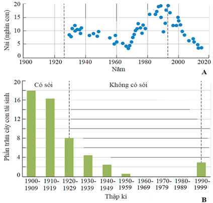 Sói xám (Canis lupus) ở vườn quốc gia Yellowstone bị con người săn bắn từ năm 1926 và dẫn đến tuyệt chủng ngay sau đó. Điều này có ảnh hưởng lớn đến cấu trúc quần xã trong đó tiêu biểu là số lượng nai sừng tấm (hình A), làm ban quản lí rừng phải chủ động giết bớt nai trong khu vực (liên tục đến năm 1968 cho đến khi quần thể nai đạt số lượng tương đối thấp mới dừng lại) và số lượng thực vật trong rừng (hình B, tỉ lệ thuận với lượng cây con tái sinh). Năm 1995, người ta quyết định nhập thêm 14 cá thể sói xám từ Canada sau 70 năm vắng bóng loài động vật ăn thịt ở vùng đất này. Phân tích các dữ liệu trên