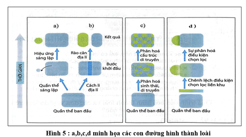 Hình 5 sau đây minh họa cho các con đường hình thành loài. Hình nào minh họa cho con đường hình thành loài cùng khu?