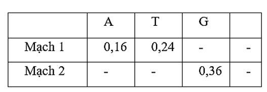 Một phân tử nucleic acid mạch kép có tỉ lệ từng loại nitrogenous base của từng mạch được thể hiện ở bảng 2 (dấu “-” thể hiện chưa xác định số liệu). Biết rằng tổng tỉ lệ 4 loại nitrogenous base trên mỗi mạch đơn là 1,00. Theo lí thuyết, cytosine (C) ở mạch 2 chiếm tỉ lệ bao nhiêu?