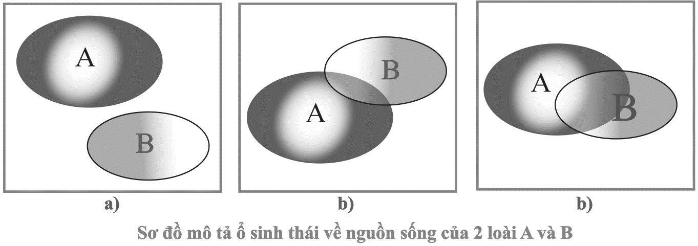 Cho hình minh họa về ổ sinh thái về nguồn sống của hai loài A và B qua ba hình a, b, c. Nhận định sau đây về hình này là Đúng?