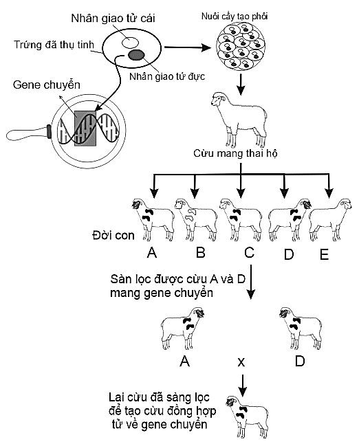 Sơ đồ mô tả các bước của quy trình tạo động vật biến đổi gene. Biết rằng có nhiều trứng và tinh trùng cho kết hợp với nhau. Nhận định sau đây về hình này là Đúng?