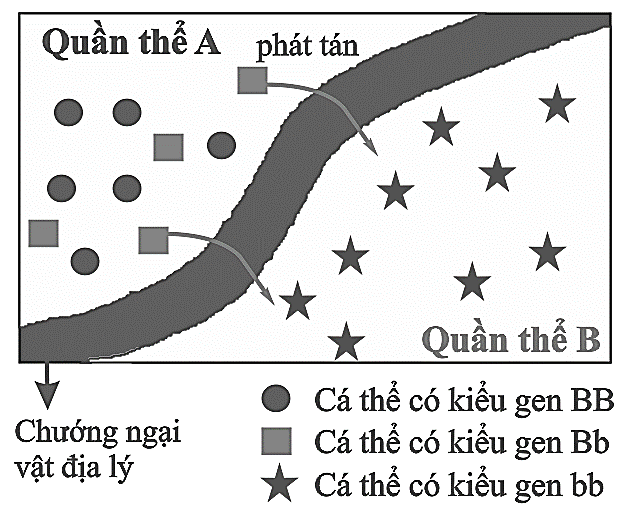 Hình mô tả hai quần thể A và B thuộc cùng một loài được cách li nhau bởi chướng ngại vật địa lý (biển, sông lớn). Cho biết có thể di cư của một số cá thể từ quần thể A sang quần thể B. Nhận định sau đây là Sai với giả thuyết trên?
