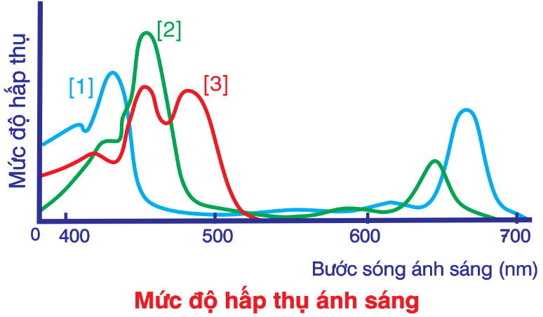 Trong quang hợp ở thực vật, đồ thị này mô tả quang phổ hấp thụ của hệ sắc tố ở thực vật sau đây: Biết: [1]. Diệp lục a; [2]. Diệp lục b; [3]. Carotenoid.