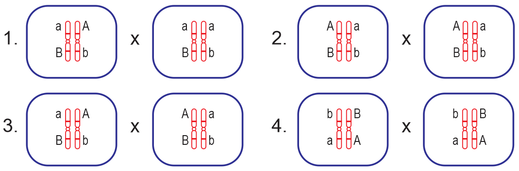 Cho lai hai nòi ruối giấm thuần chủng: thân xám, cánh dài với thân đen cánh ngắn F1 thu được toàn thân xám, cánh dài. Cho F1 tạp giao, F2 phân ly theo tỷ lệ 70% xám, dài : 5% xám, ngắn : 5% đen, dài : 20% đen, ngắn. Biết không phát sinh đột biến mới, khả năng sống của các tổ hợp gene là như nhau. Trên cơ sở tế bào học, kiểu gene của cơ thể bố mẹ F1 sau đây? Hãy viết liền các số tương với các phép lai từ nhỏ đến lớn của bố mẹ F1.