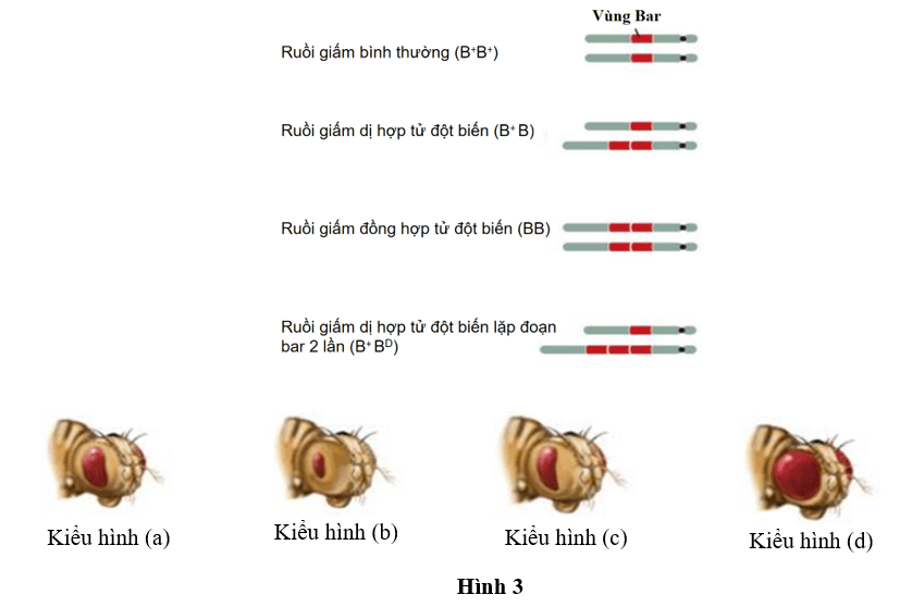 Hình 3 minh họa kiểu gene, cấu trúc NST và các kiểu hình tương ứng về hình dạng mắt ở ruồi giấm cái. Sự biểu hiện kiểu hình khác thường do đột biến lặp đoạn vùng Bar trên nhiễm sắc thế giới tính X và. NST bình thường (kí hiệu B+), NST đột biến lặp mang 1 và 2 đoạn Bar được kí hiệu lần lượt B và BD. Hậu quả của đột biến này làm cho mắt lồi thành mắt dẹt, nếu đoạn NST lặp lại càng nhiều lần thì mức độ dẹt của mắt càng tăng lên. Ruồi giấm dị hợp tử đột biến (B+B) có kiểu hình nào sau đây?