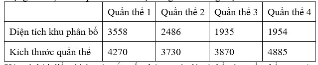 Giả sử kết quả khảo sát về diện tích khu phân bố (tính theo m2) và kích thước quần thể (tính theo số lượng cá thể) của 4 quần thể sinh vật cùng loài ở cùng một thời điểm như sau: Xét tại thời điểm khảo sát, sắp xếp thứ tự mật độ cá thể của quần thể trong 4 quần thể tăng dần theo thứ tự từ thấp đến cao.