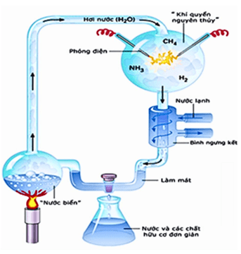 Hình 2 mô tả thí nghiệm của Miller và Urey (1953) nhằm kiểm tra giả thuyết về nguồn gốc sự sống của Oparin và Haldan: Hình 2 Việc tạo ra các hợp chất hữu cơ trong thí nghiệm trên có thể được xem là một bước quan trọng trong việc chứng minh giả thuyết nào sau đây?