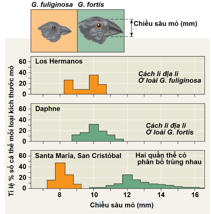 Các nghiên cứu về loài chim sẻ trên quần đảo Galápagos đã chỉ ra rằng sự thay thế sinh thái đóng vai trò quan trọng trong việc giảm cạnh tranh thức ăn giữa các loài. Cụ thể, hai loài chim sẻ Geospiza fuliginosa và Geospiza fortis có sự khác biệt về kích thước mỏ khi cùng tồn tại trong một khu vực, so với khi sống ở các khu vực riêng biệt. Kết quả nghiên cứu thể hiện ở hình bên dưới. 1. Trên đảo Santa Marta và San Cristóbal, khi hai loài chim sẻ Geospiza fuliginosa và Geospiza fortis cùng tồn tại, chúng có sự khác biệt rõ rệt nhất về tập tính sinh sản. 2. Khi hai loài Geospiza fuliginosa và Geospiza fortis sống riêng trên các đảo khác nhau, kích thước mỏ trung bình của chúng là tương tự nhau. 3. Hiện tượng phân hóa kích thước mỏ của hai loài chim sẻ khi cùng sống trong một môi trường được gọi là thay thế tính trạng. 4. Chọn lọc tự nhiên là cơ chế thúc đẩy sự phân hóa kích thước mỏ, vì nó tăng cường khả năng sống sót và giảm cạnh tranh. Sắp xếp các nhận định đúng theo thứ tự từ nhỏ đến lớn về quá trình hình thành các đặc điểm thích nghi của hai loài chim sẻ nói trên.