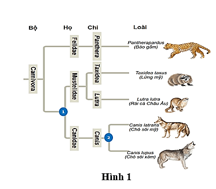 Dùng thông tin sau để trả lời câu 5 và câu 6: Hình 1 minh họa mối liên hệ giữa phân loại và phát sinh chủng loại. Phân loại theo thứ bậc được phản ảnh trên cây phát sinh phân nhánh nhỏ dần. Cây phát sinh này đánh dấu các quan hệ tiến hoá có thể giữa một số taxon trong bộ Ăn thịt (Carnivora), bản thân nó là một nhánh của lớp Thú (Mammalia). Điểm phân nhánh 1 thế hiện tổ tiên chung gần nhất của tất cả thành viên của họ Chồn (Mustellidae) với họ Chó (Canidae). Điểm phân nhánh 2 thể hiện tổ tiên chung gần nhất của chó sói Mỹ (Canis latrans) và chó sói xám (Canis lupus).