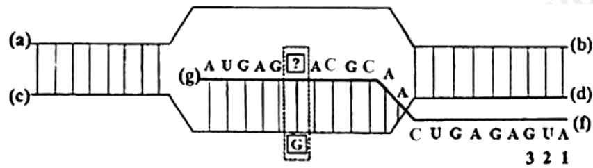 Hình dưới mô tả một giai đoạn của quá trình phiên mã xảy ra trong vùng ở sinh vật nhân sơ. Các kí hiệu (a), (b), (c), (d), (f), (g) là các vị trí tương ứng với đầu 3' hoặc 5′ của mạch polynucleotide; vị trí nucleotide 1-2-3 là bộ ba mở đầu; nucleotide chưa xác định ? liên kết với nucleotide G của mạch khuôn trong quá trình phiên mã, các nucleotide còn lại của gene không được thể hiện trên hình. Nếu nucleotide (?) trên hình là U thì phân tử mRNA này khi làm khuôn để dịch mã sẽ tạo ra chuỗi polypeptide có bao nhiêu amino acid (không kể amino acid mở đầu)?