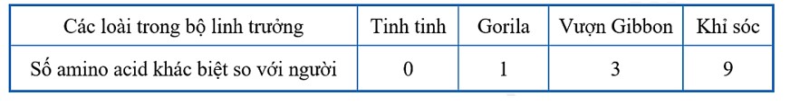Chuỗi B - hemoglobin của một số loài trong bộ Linh trưởng đều gồm 146 amino acid nhưng khác biệt nhau một số amino acid, thể hiện ở bảng sau: