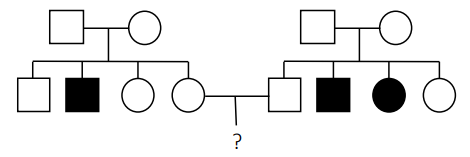 Một người đàn ông quen một người phụ nữ. Khi tìm hiểu nhau để tiến tới hôn nhân thì họ phát hiện ra rằng gia đình hai bên đều có người bị bệnh bạch tạng (do gene lặn nằm trên NST thường quy định). Cặp vợ chồng trong phả hệ trên lo sợ con mình sinh ra sẽ bị bệnh. Họ đã đến trung tâm tư vấn di truyền để tư vấn. Nhân viên tư vấn đã điều tra và vẽ được sơ đồ phả hệ như hình bên dưới. Quy ước: Nữ bình thường: ○. Nam bình thường: □. Nữ mắc bệnh: ●. Nam mắc bệnh: ■. Cặp vợ chồng ở thế hệ II hi vọng sinh con bình thường với xác suất là x/y. Cho biết x + y bằng bao nhiêu?