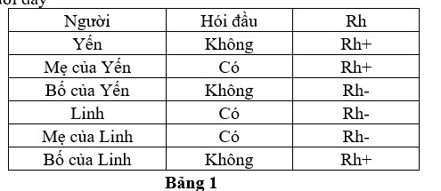 Ở người, gene quy định tính trạng hói đầu bị ảnh hưởng bởi giới tính. Phụ nữ có kiểu gene BB bị hói, tuy nhiên phụ nữ Bb và bb thì không. Đàn ông có kiểu gene BB và Bb bị hói, đàn ông bà thì không. Yếu tố Rh do gene R quy định, kiểu gene của người Rh- là r và của người Rh+ là RR hoặc Rr. Khi một người phụ nữ Rh- mang thai nhi có Rh+, hệ miễn dịch của người phụ nữ có thể tạo ra các kháng thể kháng lại Rh+ của thai nhi trong lần mang thai thứ hai, có thể dẫn đến cái chết của thai nhi. Hiện tượng này được gọi là sự không tương thích Rh. Hai gene này cùng nằm trên một cặp nhiễm sắc thể thường và cách nhau 30cM. Hai vợ chồng Yến và Linh đến một văn phòng tư vấn di truyền và được bác sĩ thu thập dữ liệu như tóm tắt trong bảng 1 dưới đây