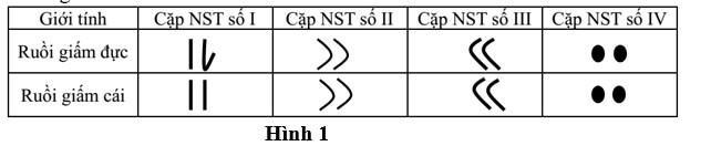 Hình 1 dưới đây mô tả hình thái các cặp nhiễm sắc thể trong bộ nhiễm sắc thể lưỡng bội (2n = 8) ở ruồi giấm bình thường. Hình 1 Cặp nhiễm sắc thể giới tính ở ruồi giấm theo mô tả của hình trên là