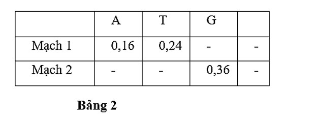 Một phân tử nucleic acid mạch kép có tỉ lệ từng loại nitrogenous base của từng mạch được thể hiện ở bảng 2 (dấu “-” thể hiện chưa xác định số liệu). Biết rằng tổng tỉ lệ 4 loại nitrogenous base trên mỗi mạch đơn là 1,00. Theo lí thuyết, cytosine (C) ở mạch 2 chiếm tỉ lệ bao nhiêu?