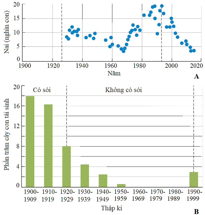 Sói xám (Canis lupus) ở vườn quốc gia Yellowstone bị con người săn bắn từ năm 1926 và dẫn đến tuyệt chủng ngay sau đó. Điều này có ảnh hưởng lớn đến cấu trúc quần xã trong đó tiêu biểu là số lượng nai sừng tấm (hình A), làm ban quản lí rừng phải chủ động giết bớt nai trong khu vực (liên tục đến năm 1968 cho đến khi quần thể nai đạt số lượng tương đối thấp mới dừng lại) và số lượng thực vật trong rừng (hình B, tỉ lệ thuận với lượng cây con tái sinh). Năm 1995, người ta quyết định nhập thêm 14 cá thể sói xám từ Canada sau 70 năm vắng bóng loài động vật ăn thịt ở vùng đất này. Phân tích các dữ liệu trên