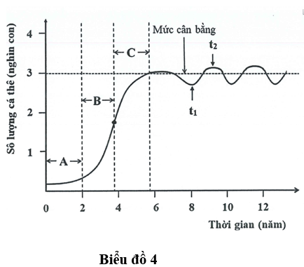 Biểu đồ 4 mô tả sự thay đổi số lượng cá thể của một quần thể động vật giả định trong điều kiện môi trường tương đối ổn định theo thời gian. Trong đó, A, B, C biểu diễn các giai đoạn tăng trưởng của quần thể; t₁, t₂ là thời điểm cụ thể trong quá trình tăng trưởng của quần thể. Phát biểu nào sau đây về đồ thị này là đúng?