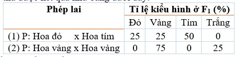 d) (P) hoa đỏ - phép lai (1) x (P) hoa vàng - phép lai (2) có thể có 2 sơ đồ lai thu được F1 có tỉ lệ hoa tím chiếm 50%.