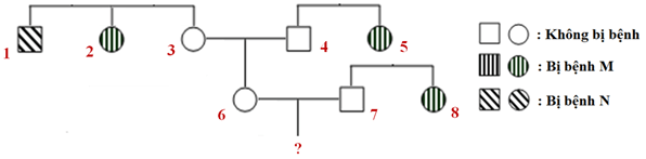 Ở người, xét bệnh M và N, mỗi bệnh đều do 1 trong 2 allele của 1 gene quy định, 2 gene phân li độc lập và các allele trội là trội hoàn toàn. Cho biết những người số (3), (4), (6), (7) và bố, mẹ của họ đều không bị bệnh M và không bị bệnh N; bố của người số (3) không mang allele gây bệnh N. Theo lí thuyết, xác suất sinh con trai đầu lòng không bị bệnh M và không bị bệnh N của cặp vợ chồng (6) và (7) là