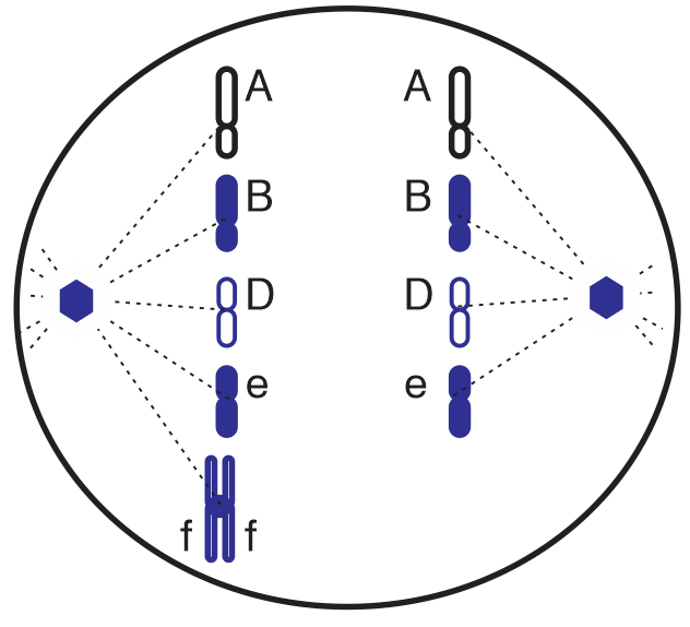 Quá trình giảm phân ở một tế bào lưỡng bội được ghi nhận như hình 5. Các kí hiệu A, B, D, e, f là các gene trên nhiễm sắc thể. Hình 5 Kết thúc quá trình phân bào này thì các tế bào con đều hình thành giao tử. Nếu một giao tử mang đột biến thừa nhiễm sắc thể này kết hợp với 1 giao tử bình thường khác thì sẽ hình thành hợp tử có bao nhiêu nhiễm sắc thể?