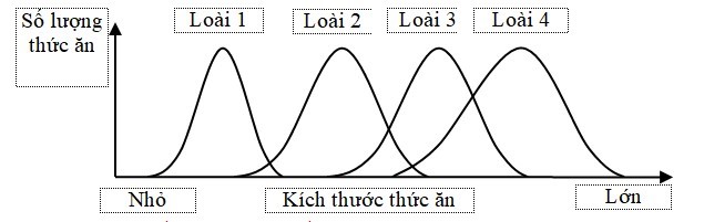 Nghiên cứu ổ sinh thái dinh dưỡng của 4 loài sinh vật trong một môi trường sống. Kết quả nghiên cứu được ghi lại dưới dạng các đồ thị trong hình 2 như sau Hình 2 Phân tích hình 2 và cho biết nhận định nào dưới đây không đúng?