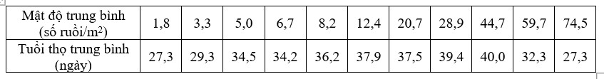 Một thí nghiệm nghiên cứu ảnh hưởng của mật độ ruồi giấm lên tuổi thọ của chúng thu được kết quả như ở bảng sau: