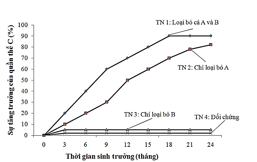 Khi nghiên cứu sự ảnh hưởng của loài A và B đến sự sinh trưởng và phát triển của loài C, người ta thực hiện các thí nghiệm như sau: - Thí nghiệm 1 (TN1): Loại bỏ cả 2 loài A và B ra khỏi khu vực loài C sinh sống. - Thí nghiệm 2 (TN2): Loại bỏ loài A ra khỏi khu vực loài C sinh sống. - Thí nghiệm 3 (TN3): Loại bỏ loài B ra khỏi khu vực loài C sinh sống. - Thí nghiệm 4 (TN4 - Đối chứng): Cả loài A và loài B sinh trưởng cùng trong khu vực loài C sinh sống. Sau 24 tháng theo dõi thí nghiệm, kết quả thu được biểu thị ở đồ thị 2 như sau:
