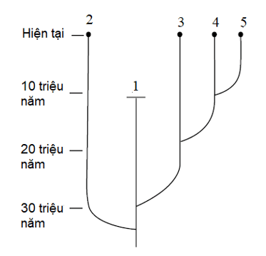 Hình bên mô tả cây phát sinh chủng loại, loài số bao nhiêu có khả năng xuất hiện sớm nhất?