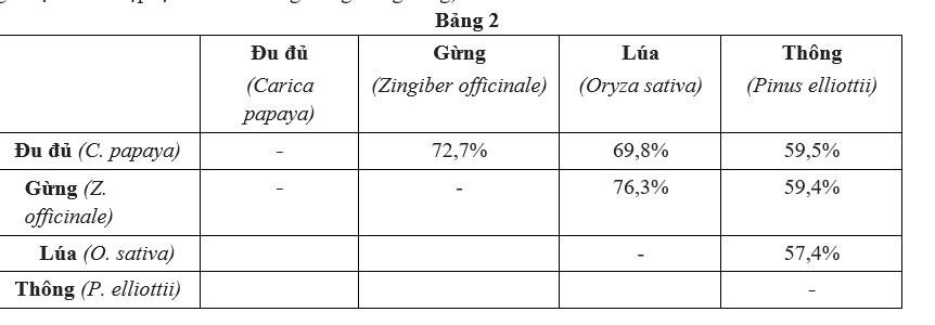 Dùng thông tin ở sau để trả lời câu 5 và câu 6: Maturase K là một gene mã hóa enzyme maturase, có vai trò quan trọng trong quá trình cắt bỏ intron trong RNA (splicing) ở lục lạp. Để xác định quan hệ tiến hóa giữa các loài thực vật, các nhà khoa học đã tiến hành nghiên cứu mức độ giống nhau của gene mã hóa Maturase K và thu được kết quả ở Bảng 2, (các giá trị so sánh cùng loài thể hiện bằng dấu “-” và các giá trị so sánh lặp lại là các khoảng trống trong bảng).