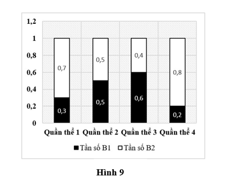 Ở một loài thực vật, allele B1 quy định quả đỏ là trội hoàn toàn so với allele B2 quy định quả vàng. Tần số allele B1 và B2 được biểu diễn qua biểu đồ Hình 9, biết các quần thể được biểu diễn trong biểu đồ đã cân bằng di truyền. Hãy sắp xếp các quần thể này theo thứ tự tăng dần tần số kiểu gene thể dị hợp?