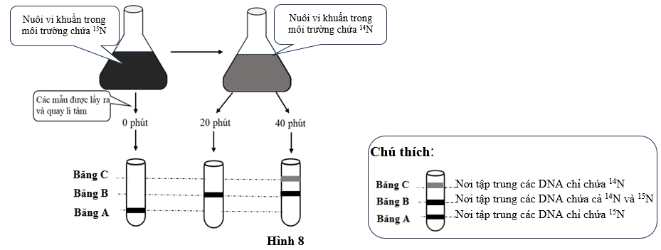 Tại viện công nghệ California, Matthew Meselson và Franklin Stahl đã nuôi cấy tế bào E.coli qua một số thế hệ trong môi trường chứa các nucleotide tiền chất được đánh dấu bằng đồng vị phóng xạ 15N. Các nhà khoa học sau đó chuyển vi khuẩn sang môi trường chỉ chứa đồng vị 14N. Sau 20 phút và 40 phút, các mẫu vi khuẩn nuôi cấy được hút ra. Meselson và Stahl có thể phân biệt được các phân tử DNA có tỷ trọng khác nhau bằng phương pháp ly tâm sản phẩm DNA được chiết rút từ vi khuẩn. Biết rằng mỗi vi khuẩn E.coli nhân đôi sau mỗi 20 phút trong môi trường nuôi cấy. (Hình 8)