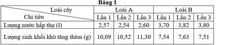 Các nhà khoa học đã sử dụng hai loài cây A và B (một loài thực vật C3 và một loài thực vật C4) để so sánh giữa hai loài về mối liên hệ giữa nhu cầu nước và lượng chất khô tích lũy trong cây. Sau cùng một thời gian sinh trưởng, các giá trị trung bình về lượng nước hấp thụ và lượng sinh khối khô tăng thêm được thống kê sau 3 lần lặp lại thí nghiệm và thể hiện trong Bảng 1. Biết rằng, các cây thí nghiệm được trồng trong điều kiện canh tác tối ưu, giống nhau về độ tuổi và khối lượng tươi (tương quan với sinh khối khô).