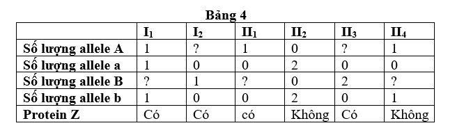 Bảng 4 thể hiện số lượng các allele và sự xuất hiện hay không của protein Z trong một tế bào sinh dưỡng bình thường của 6 người trong một gia đình (dấu “?”biểu thị chưa biết số lượng); bố mẹ thuộc thế hệ I; con cái thuộc thế hệ II, trong đó có 2 người con ruột, 1 người con dâu và 1 người con rể. Xét 2 gene, mỗi gene gồm 2 allele (A, a và B, b) liên kết hoàn toàn trên vùng không tương đồng của nhiễm sắc thể giới tính X. Khi kiểu gene có mặt đồng thời cả hai allele trội A và B thì tế bào sẽ tổng hợp được protein Z.