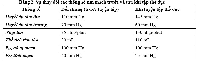 Để tìm hiểu về phản ứng của hệ tim mạch đối với việc luyện tập thể dục, một phụ nữ đáp ứng các tiêu chí nghiên cứu (tuổi từ 25 đến 40, không sử dụng thuốc, có cân nặng phù hợp với chiều cao và huyết áp bình thường) đã được lựa chọn để nghiên cứu. Trước khi người phụ nữ bắt đầu luyện tập, người ta tiến hành đo các thông số đối chứng, bao gồm huyết áp, nhịp tim, PO₂ động mạch, PO₂ tĩnh mạch và thể tích tâm thu. Sau đó, người phụ nữ này thực hiện bài tập đi bộ trên máy chạy bộ trong 30 phút với tốc độ 3 dặm/giờ. Trong suốt quá trình luyện tập, huyết áp và nhịp tim của cô được theo dõi liên tục, trong khi giá trị PO₂ động mạch và PO₂ tĩnh mạch được đo vào cuối giai đoạn tập luyện và thể hiện trong Bảng 2.