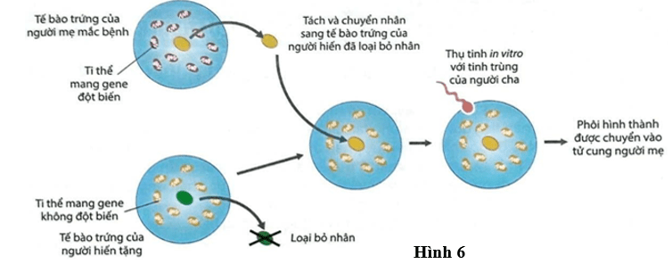 Ở người, đột biến gene trong ty thể là một trong những nguyên nhân dẫn đến bệnh động kinh. Để chữa bệnh di truyền này, các nhà khoa học đã sử dụng phương pháp sinh trẻ “ba cha mẹ” được mô tả bằng sơ đồ Hình 6 sau: