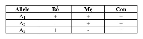 Xét hai gene nằm trên nhiễm sắc thể số 21: Gene thứ nhất có 3 allele (A1, A2, A3), gene thứ hai có 2 allele (B1, B2). Một gia đình đều có bố mẹ bình thường, sinh được một đứa con bị hội chứng Down thể Trisomy 21. Bằng kĩ thuật di truyền người ta phân tích và xác định được sự có mặt của các allele thuộc gene thứ nhất trong tế bào sinh dưỡng của từng người, kết quả được mô tả ở bảng sau đây. Dấu “+” là có allele, “-” là không có allele trong tế bào.
