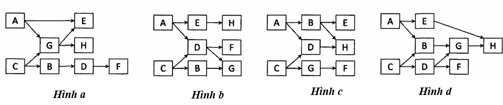 Giả sử lưới thức ăn của một quần xã sinh vật gồm các loài sinh vật được kí hiệu là: A, B, C, D, E, F, G và H. Cho biết loài A và loài C là sinh vật sản xuất, các loài còn lại đều là sinh vật tiêu thụ. Trong lưới thức ăn này, nếu loại bỏ loài C ra khỏi quần xã thì chỉ loài D và loài F mất đi. Sơ đồ lưới thức ăn nào sau đây đúng với các thông tin đã cho?
