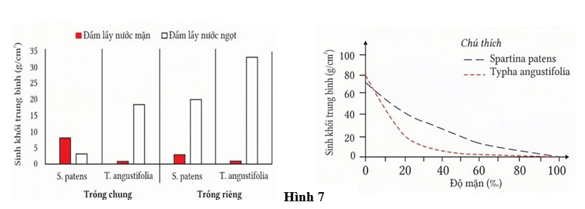 Spartina patens và Typha angustifolia là những loài thực vật đầm lầy ở khu vực nội lục châu Mỹ. Để nghiên cứu ảnh hưởng của nước biển tới hai loài loài thực vật này, các nhà nghiên cứu đã tiến hành một loạt các thí nghiệm: Trồng chung hoặc trồng riêng hai loài thực vật trong các đầm lầy nước mặn và đầm lầy nước ngọt với các độ mặn khác nhau. Sinh khối trung bình (g/cm2) của hai loài được thể hiện ở Hình 7.