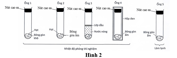 Để khảo sát các điều kiện cần thiết cho sự nảy mầm của hạt, người ta bố trí thí nghiệm như Hình 2. Cho biết thí nghiệm sử dụng hạt đậu xanh đã phơi khô. Theo lí thuyết, sau 2 đến 3 ngày, các hạt trong những ống nghiệm nào sẽ nảy mầm?