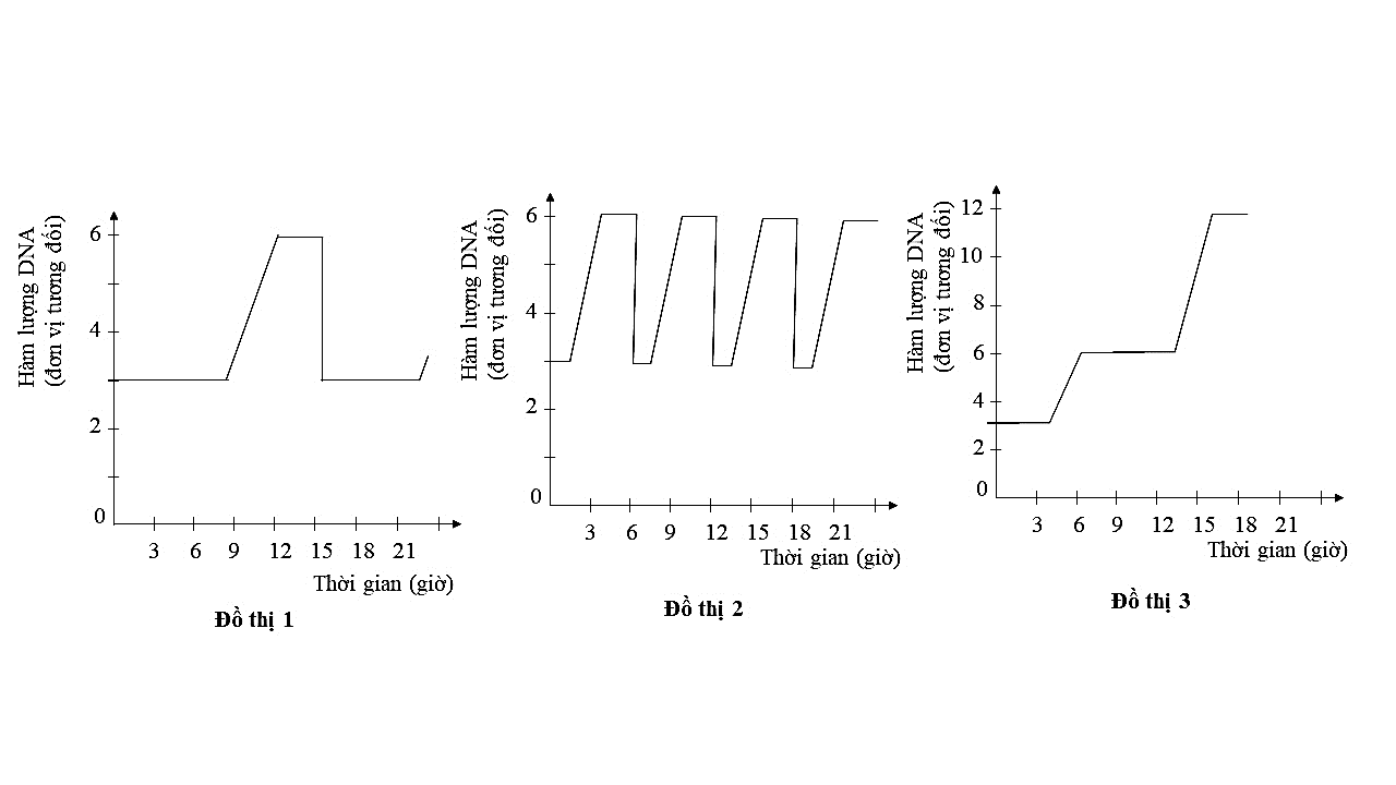 Khi nghiên cứu sự thay đổi hàm lượng tương đối của DNA ở tế bào biểu bì ở người, tế bào phôi sớm của nhím, hợp bào của một loài nấm nhày (biết nấm nhày chỉ có nhân phân chia không phân chia tế bào chất) thu được 3 đồ thị như hình sau: